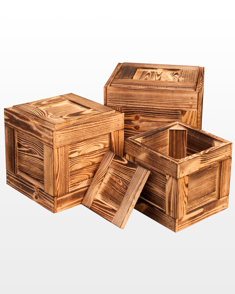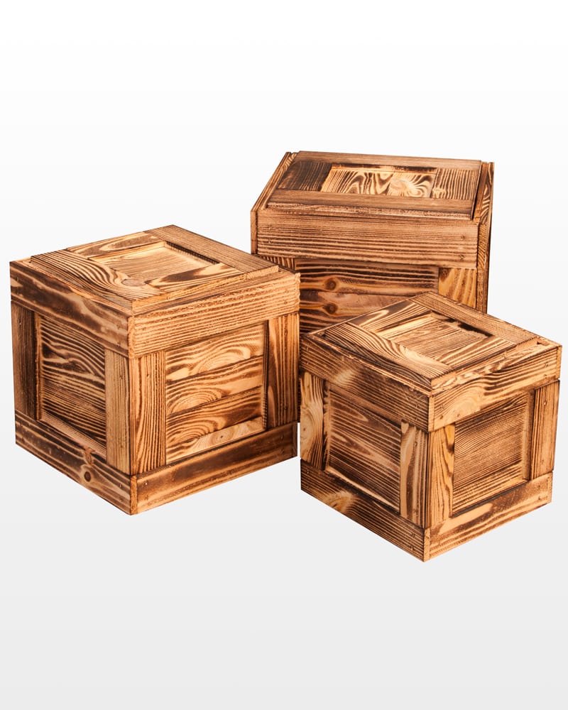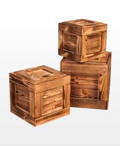 Набор ящиков-кубов обожженных – состоит из ящиков следующих размеров: 25х25х25, 30х30х30, 35х35х35 см. Ящики-кубы деревянные являются тарой широкого применения. Ящики деревянные (25х25х25, 30х30х30, 35х35х35 см) изготовлены из натуральной древесины, толщиной планки 10мм. Глухие обожженные ящики находят широкое применение при декорировании витрин, неглубоких стеллажей, хранения фруктов и ягод. Из деревянных ящиков производят стеллажи, стенки, креативные полки, столы и стулья, шкафы и другие виды мебели.